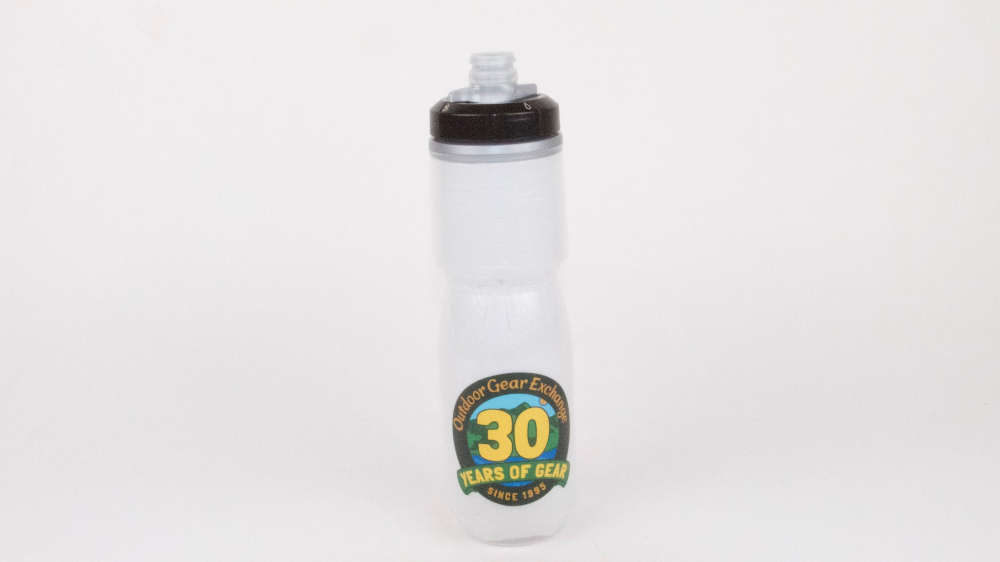 This is no normal Podium Chill 3.0 24oz bike water bottle. It's a Podium Chill 3.0 24oz bike water bottle with Outdoor Gear Exchange's 30 Years of Gear logo! This bottle features a double-walled construction to keep your hydration cold twice as long, and is designed to fit most bottle cages.